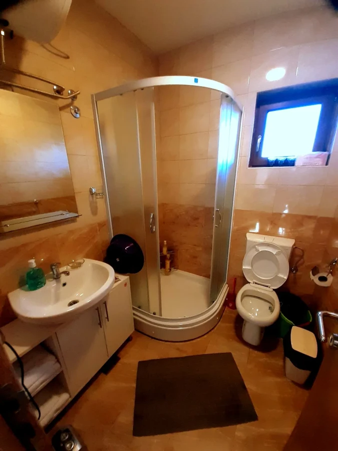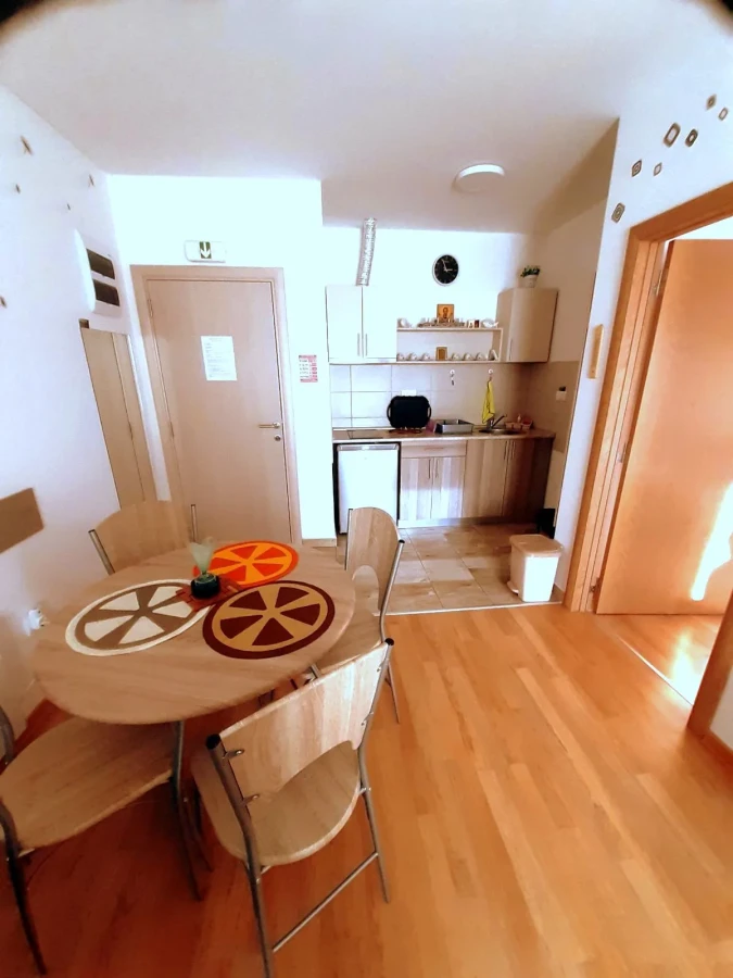 Apartman je za 4 osobe. Poseduje kuhinju sa kompletnim priborom i opremom za spremanje i konzumiranje hrane i pića, kao i za higijenu sudova. U dnevnoj sobi se, pored stola za ručavanje, nalazi ugaona garnitura koja se razvlači u ležaj za dve osobe. Kupatilo ima WC papir, sapune, šampon, sredstva i pribor za higijenu, sušilicu za veš i fen za sušenje kose. Apartman ima terasu sa garniturom za sedenje i na nju se izlazi iz dnevne i spavaće sobe. Pored toga, gostima je na raspolaganju kompletna posteljina za spavanje, po dva peškira i sobne papuče.